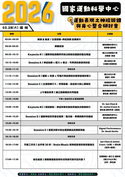 本研討會將邀請國內外學者與實務專家,分享 神經回饋、生理回饋與心理技能訓練 在運動表現與壓力情境調節中的應用。
